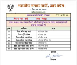 सूची निम्न प्रकार से है जिला उपाध्यक्ष पंकज मिश्रा राज पटेल परविन्द चौहान अमित श्रीवास्तव विनय सिंह अजय सरोज नीरज मौर्य श्रीमती पुष्पा निषाद जिला महामंत्री पीयूष गुप्ता संदीप तिवारी अजय सिंह जिला मंत्री संतोष मिश्रा राजकेशर पाल धमेन्द्र मिश्रा डॉ० देवी प्रसाद सिंह श्रीमती अंशू नीरज मौर्या राजेश गुप्ता सुधांशु सिंह विकास शर्मा जिला कोषाध्यक्ष श्रीमती रीता जायसवाल जिला सह कोषाध्यक्ष नारायण दास चौरसिया जिला कार्यालय मंत्री दीपक सिंह (मान्टो) जिला कार्यालय सह मंत्री घनश्याम यादव जिला मिडिया प्रभारी आमोद सिंह जिला मिडिया सह प्रभारी डॉ० अमरनाथ पाण्डेय विशाल गौतम जिला आई.टी. संयोजक रोहन सिंह जिला आई०टी० सह संयोजक अमित पाठक कुवँर दिग्विजय सिंह जिला संयोजक सोशल मीडिया सिद्वार्थ राय जिला सह संयोजक सोशल मीडिया अवनीश यादव विजय यादव हुए।