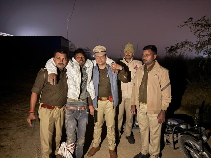 पुलिस अधीक्षक देवरिया श्री संजीव सुमन द्वारा जनपद में अपराध एवं अपराधियों के रोकथाम के लिए चलाए जा रहे अभियान के क्रम में अपर पुलिस अधीक्षक के कुशल निर्देशन व क्षेत्राधिकारी नगर श्री संजय कुमार रेड्डी के कुशल पर्यवेक्षण में थाना कोतवाली पुलिस द्वारा रूद्रपुर मोड़ पर चेकिंग के दौरान मुखबीर खास की सूचना पर 25000/- रुपये का ईनामिया अभियुक्त गोविन्द कुमार उर्फ केदार पुत्र रामआसरे उर्फ रामसरे निवासी ग्राम बरौली थाना भलुअनी जनपद देवरिया जिसके उपर चैन स्नेचिंग के कई मुकदमें व अन्य मुकदमें पंजीकृत हैं गिरफ्तार किया गया । उ०नि० अविनाश मौर्य मय टीम के खोराराम पुलिया के पहले रजला मोड़ के पास चेकिंग कर रहे थे कि तभी एक मोटरसाईकिल आती हुई दिखाई दी, जिसे रोकने का प्रयास किया गया तो वह गाड़ी मोड़कर भागना चाहा परन्तु मोड़ते वक्त ही गाड़ी फिसलकर गिर गयी और वह पास की झाडी के तरफ भागने लगा। पुलिस वालो द्वारा चेतावनी व ललकारते हुये रूकने को कहा गया, किन्तु उक्त व्यक्ति पुलिस वालो पर जान से मारने की नियत से पास लिये हुये असलहे से पुलिस वालो को लक्ष्य बनाकर फायर कर दिया। पुलिस वाले उक्त फायर से बाल-बाल बच गये तथा पुलिस वालो के पास अन्य कोई रास्ता ना पाकर पुलिस बल द्वारा व्यक्ति के शरीर के निचले हिस्से को लक्ष्य बनाकर पुलिस टेक्टिस व दौराने ट्रेनिग सिखलाये गये तरिको का प्रयोग करते हुये अपनी सरकारी पिस्टल से फायर किया गया। उपरोक्त व्यक्ति घायल होकर झाड़ी में गिर पड़ा जिसके दाहिने पैर के घुटने के पास रक्तस्राव हो रहा है। पकड़े गये व्यक्ति से नाम पता पूछा गया तो अपना नाम गोविन्द कुमार उर्फ केदार पुत्र रामआसरे उर्फ रामसरे निवासी ग्राम बरौली थाना भलुअनी जनपद देवरिया बताया। पकडे गये व्यक्ति के कब्जे से एक अदद तमन्चा 303 बोर व एक अदद जिन्दा कारतूस 303 बोर व एक अदद खोखा कारतूस 303 बोर बरामद हुआ व एक अदद पीली धातु की चेन व 21280/- रूपये व मोटरसाइकिल सिल्वर रंग हीरो स्पलेण्डर बरामद हुआ। अभियुक्त गोविन्द कुमार को समय करीब 23.35 बजे हिरासत पुलिस में लिया गया तथा अभियुक्त उपरोक्त को जुर्म 304(2)/317 (2)/3 (5) बीएनएस व धारा 109 (1) बीएनएस व 3/25 आर्म्स एक्ट में गिरफ्तार कर अन्य विधिक कार्यवाही की जा रही है।
