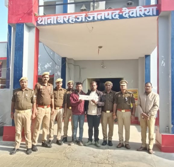 देवरिया पुलिस अधीक्षक देवरिया श्री संजीव सुमन द्वारा जनपद में अपराध एवं अपराधियों की रोकथाम व वांछित/वारण्टी/गो-तस्करों की गिरफ्तारी हेतु चलाये जा रहे अभियान के क्रम में अपर पुलिस अधीक्षक दक्षिणी श्री सुनील कुमार सिंह के कुशल निर्देशन व क्षेत्राधिकारी बरहज श्री राजेश चतुर्वेदी के कुशल पर्यवेक्षण में थाना बरहज पुलिस द्वारा विगत रात्रि को मुखबिर की सूचना पर बरेजी पुल से पहले एक पीकप वाहन संख्या से बिहार व बंगाल ले जायी जा रही 07 राशि गोवंशीय पशुओं के साथ 02 अभियुक्तों क्रमशः1. मुकेश चौहान पुत्र पलकधारी चौहान साकिन सुरही बुजुर्ग भाना सरायमीर जनपद आजमगढ़, 2. छोटे लाल चौहान पुत्र संजय कुमार साकिन कादीपुर उसरहिया थाना जलालपुर जनपद जौनपुर को गिरफ्तार कर एक फर्जी नंबर प्लेट UP 50DT 0762, जो उक्त पीकप पर लगा था, को बरादम किया गया ।