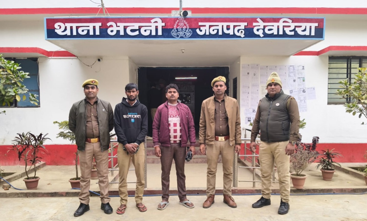 देवरिया पुलिस अधीक्षक देवरिया श्री संजीव सुमन द्वारा जनपद में अपराध एवं अपराधियों की रोकथाम हेतु चलाए जा रहे अभियान के क्रम में अपर पुलिस अधीक्षक दक्षिणी श्री सुनील कुमार सिंह के कुशल निर्देशन व क्षेत्राधिकारी भाटपार रानी श्री अंशुमन श्रीवास्तव के कुशल पर्यवेक्षण में थाना भटनी पुलिस द्वारा थाना स्थानीय पर पंजीकृत मु0अ0सं0 23/2026 धारा 3(1) उ0प्र0 गिरोहबन्द समाज विरोधी क्रियाकलाप अधि0,1986 में वांछित 02 अभियुक्त नाम पता क्रमशः 1. पंकज कुमार पुत्र रमेश प्रसाद निवासी परसौनी थाना भटनी जनपद देवरिया व 2. विकाश कुमार पुत्र पवन प्रसाद निवासी पुरनाछापर थाना भटनी जनपद देवरिया को विगत रात्रि में मुखबिर की सूचना पर चांदपार अंडर पास भरथुआ मार्ग से गिरफ्तार करते हुए नियमानुसार विधिक कार्यवाही की जा रही है।