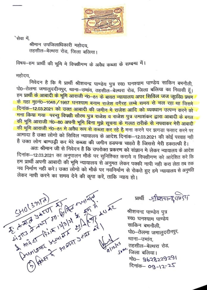 बिल्थरारोड। उभांव थाना क्षेत्र के बभनौली गांव निवासी पीड़ित की जमीन पर विपक्षी द्वारा किये गए अवैध कब्जा को हटाने के लिए एसडीएम के आदेश के बाद भी उभांव पुलिस द्वारा कोई पहल नही करने पर पीड़ित न्याय के लिए दर-दर भटक रहा है। ज्ञात हो कि उभांव थाना क्षेत्र के बभनौली गांव निवासी श्रीशचंद पाण्डेय पुत्र स्व0 घनश्याम पाण्डेय की जमीन का मामला विपक्षी से न्यायालय में चल रहा है। ऐसी बीच विपक्षी द्वारा बिना नापी कराए कब्जा किया जा रहा है। जिसको लेकर पीड़ित श्रीशचंदपाण्डेय ने उपजिलाधिकारी को शिकायती पत्र दिया। मामले को संज्ञान में लेते हुए एसडीएम ने इंस्पेक्टर उभांव को तुरंत अवैध कब्जा रोकने का निर्देशित किया है। इसके बावजूद भी कोई पहल न होने से पीड़ित इधर उधर न्याय के लिए चक्कर लगा रहा है।