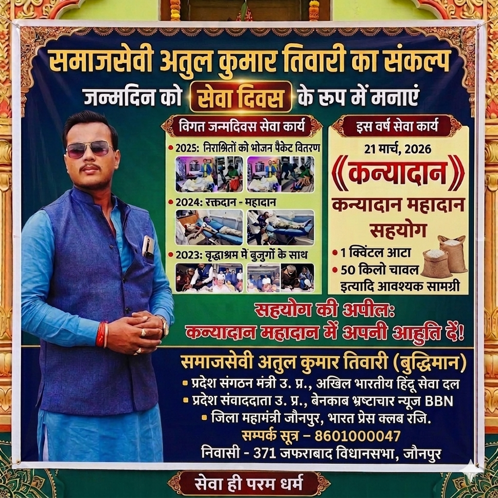 “जन्मदिन बना ‘सेवा दिवस’: बीमार पत्रकार की बेटी की शादी में मदद का हाथ बढ़ाएंगे समाजसेवी अतुल तिवारी”